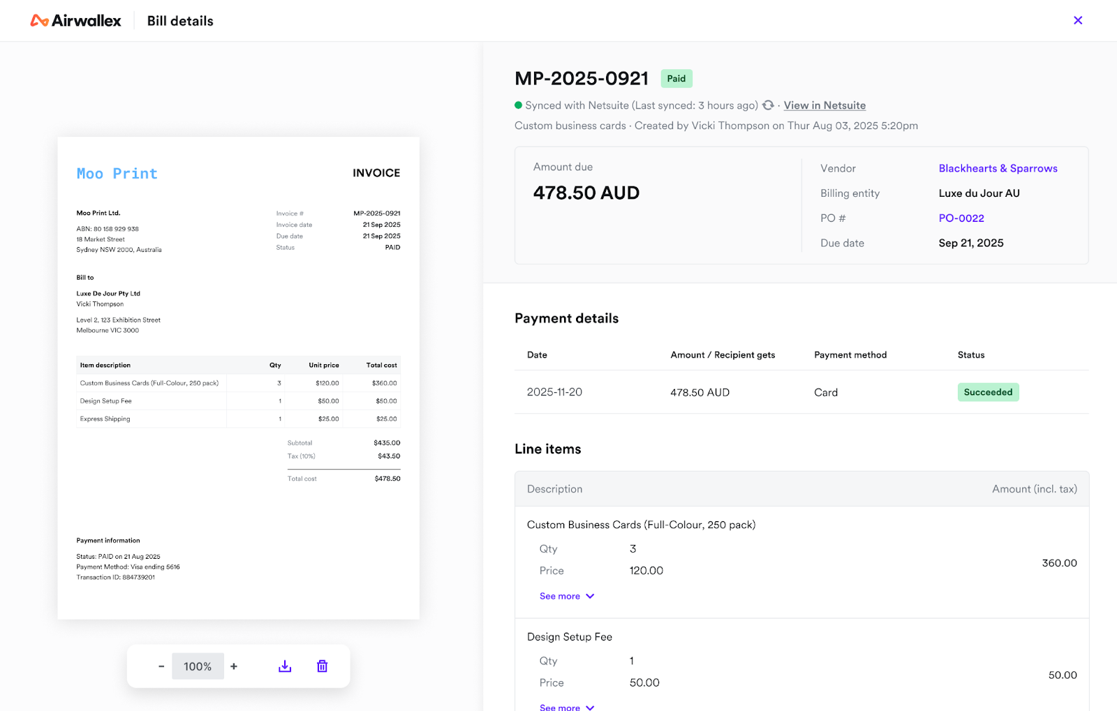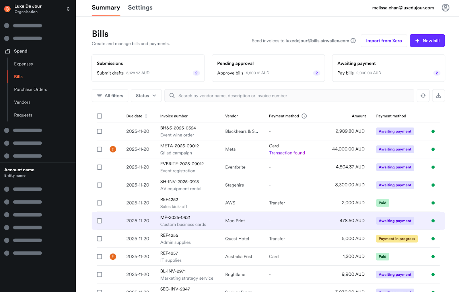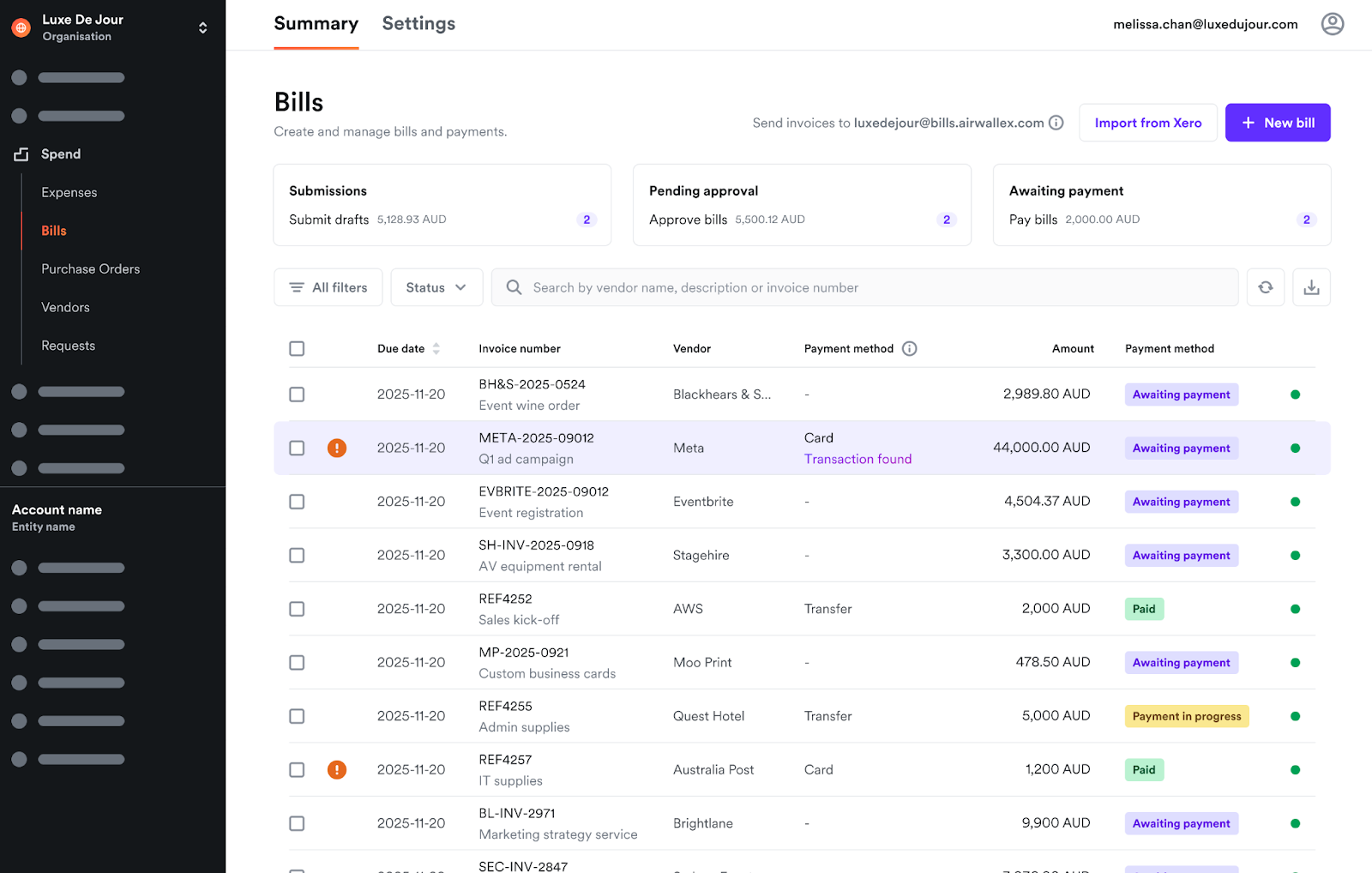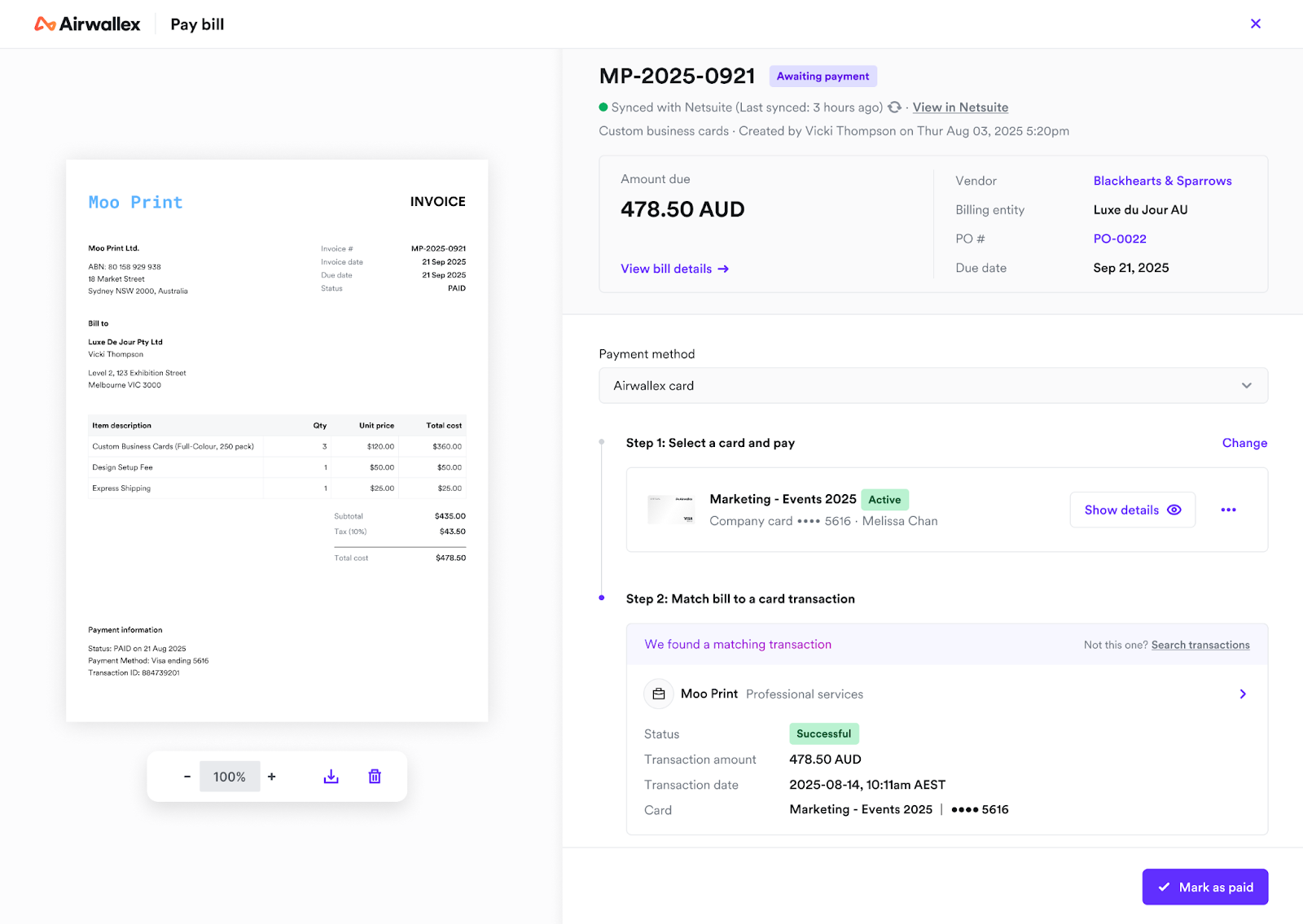 - Mark bills as ‘Paid’ by matching a card transaction to the bill. Airwallex automatically suggests transactions on linked cards that match the bill, so you can easily mark the bill as paid.