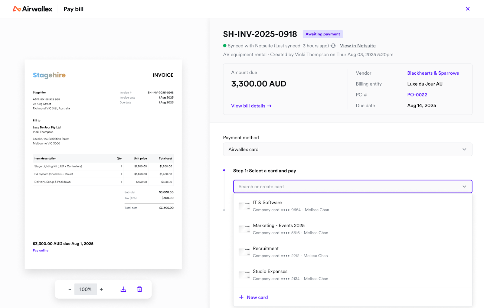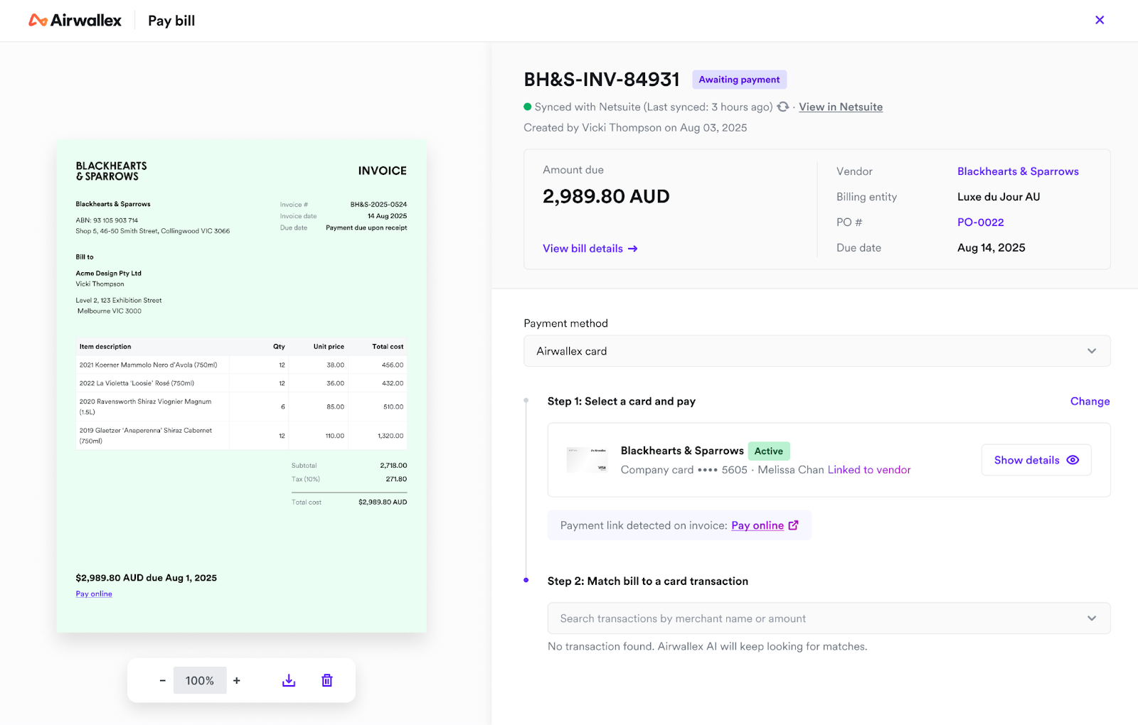 Card payments can be to a single bill at a time. First, select the bill Awaiting Payment. During the Pay bill flow, you can select ‘Airwallex card’ as a payment method. Airwallex will also suggest this option if we find cards linked to the vendor or PO for this bill, or if we detect information on card payments within the invoice attachment.