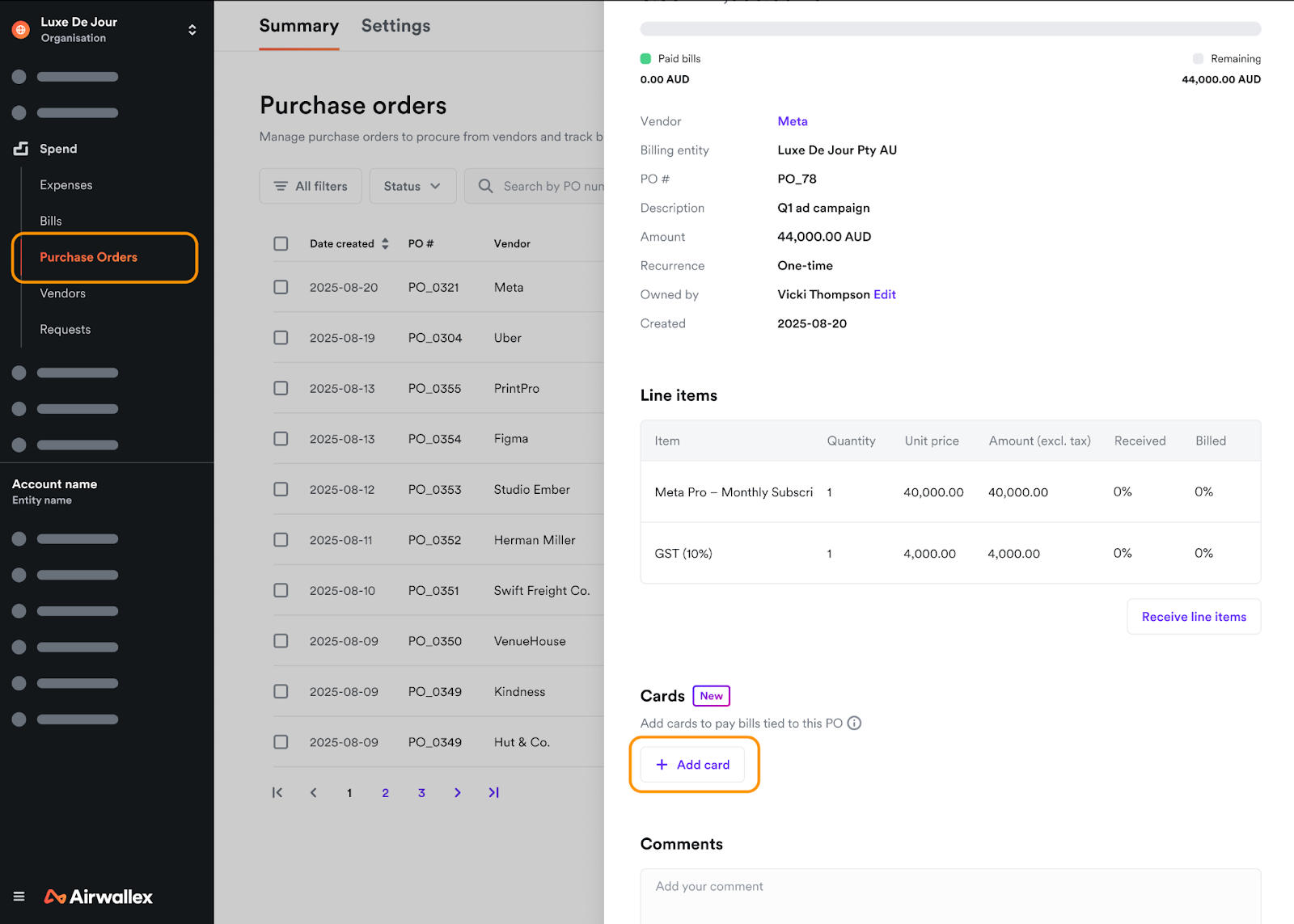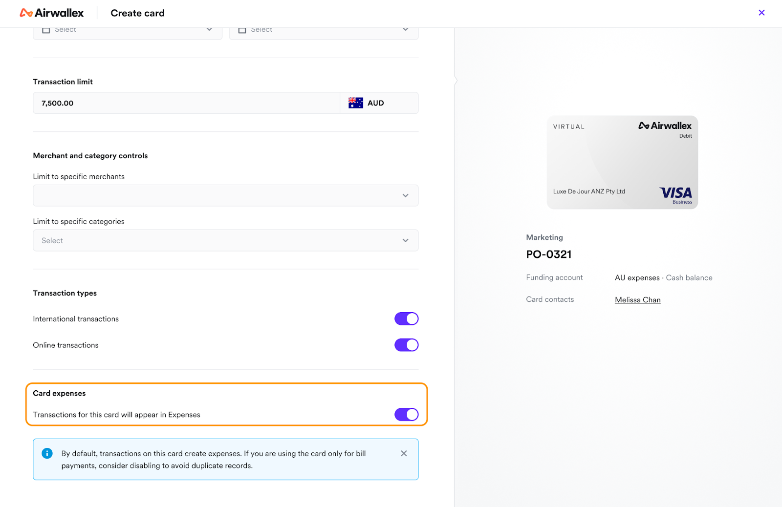 Airwallex automatically suggests card details like limits, currency, and recurrence where possible, and will also suggest the Vendor Owner (or PO Owner) as a card contact. You can update card details before confirming card creation.