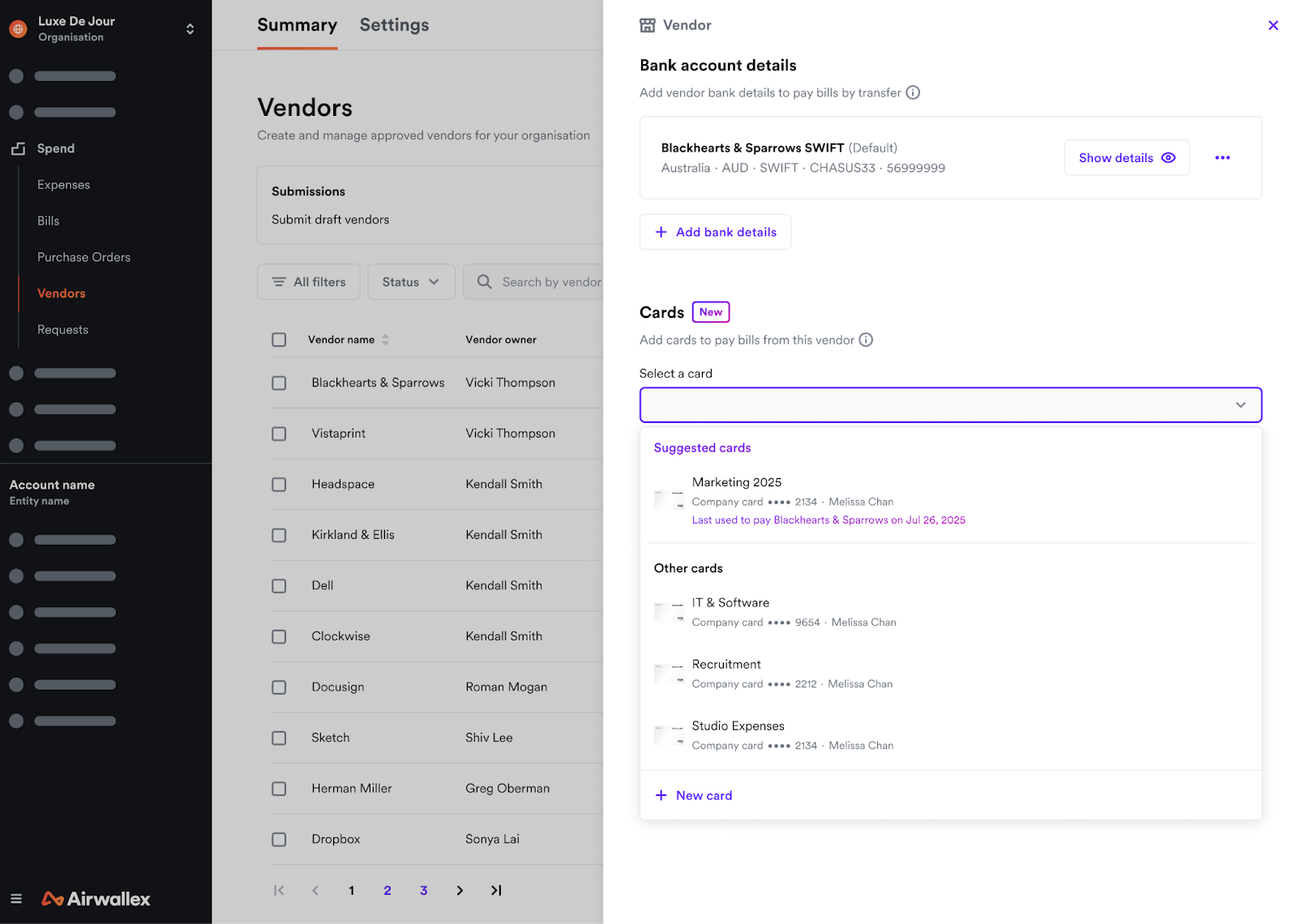 You can use your Airwallex company credit cards to pay vendor bills seamlessly within Airwallex Bill Pay. Paying bills by card is a great way to unlock cash flow benefits, card incentives, tighter spend controls, and operational efficiency in reconciling payments with bills. With Airwallex, you can: