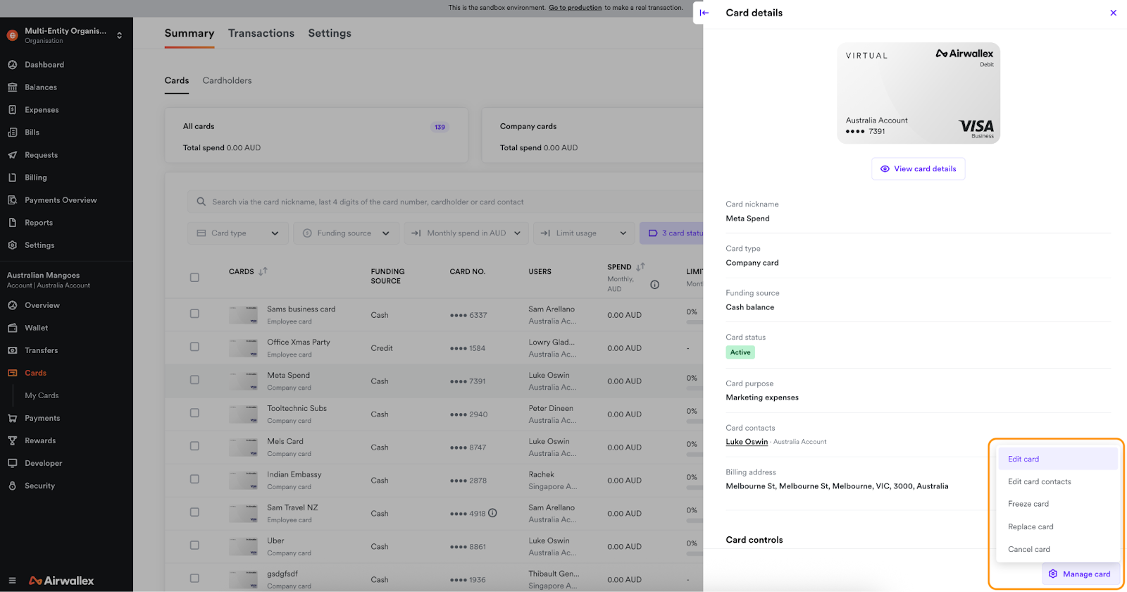 After selecting ‘Airwallex card’ as the payment method, you can then select from an existing Airwallex card or create a new single use card.