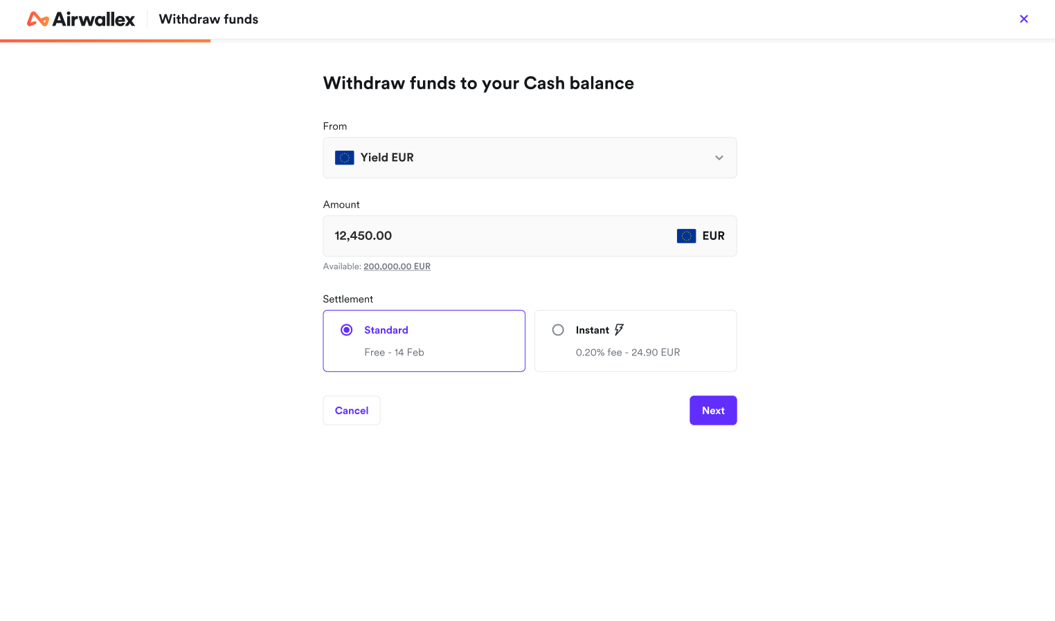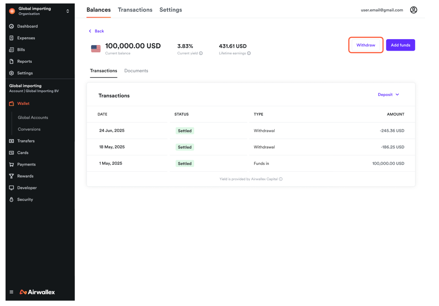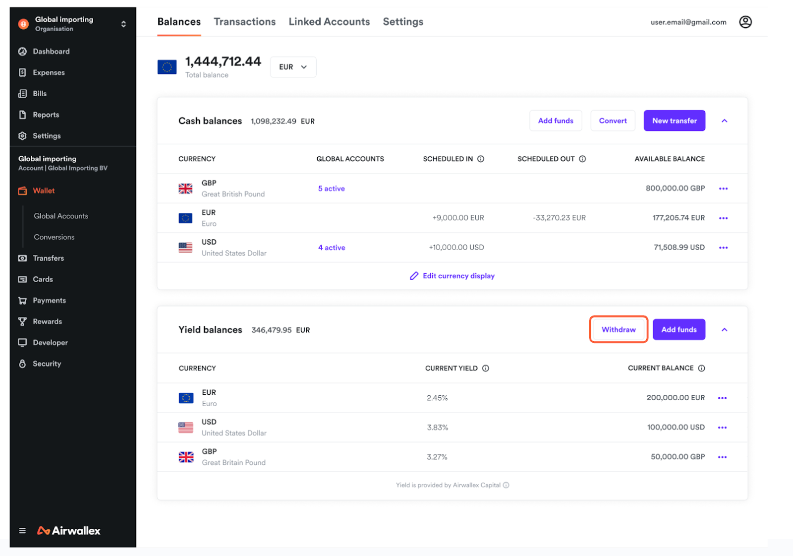 Access to the Yield product requires customers to hold and maintain an account with Airwallex (Netherlands) B.V., which is authorised as an electronic money institution and supervised by De Nederlandsche Bank. If your Airwallex account is closed or suspended, access to the Yield product will no longer be available. Staff of Airwallex (Netherlands) B.V. may be remunerated in connection with the distribution of the Yield product. Airwallex has policies and procedures to identify and manage potential conflicts of interest. Further information is available upon request.