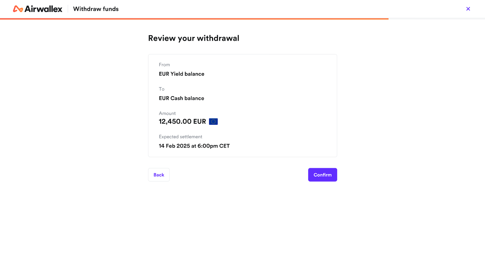 - Review the information you’ve inputted and click “Confirm” to submit your withdrawal request. You will receive an email with an estimated date for when funds will be disbursed, normally in 1 business day. The confirmation page for the transaction will also confirm the estimated settlement date.