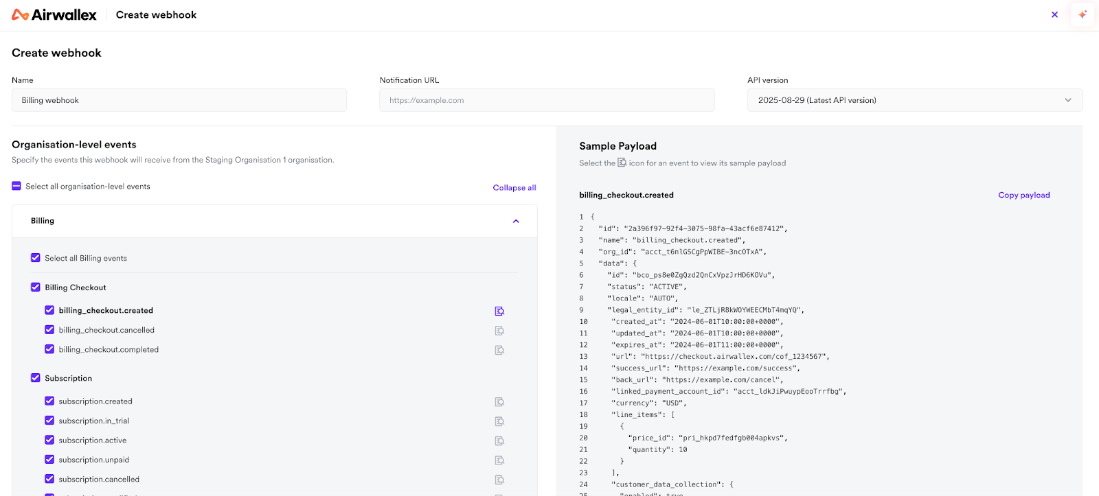 - Create new webhook subscriptions, with organisation-level Billing events selected.
