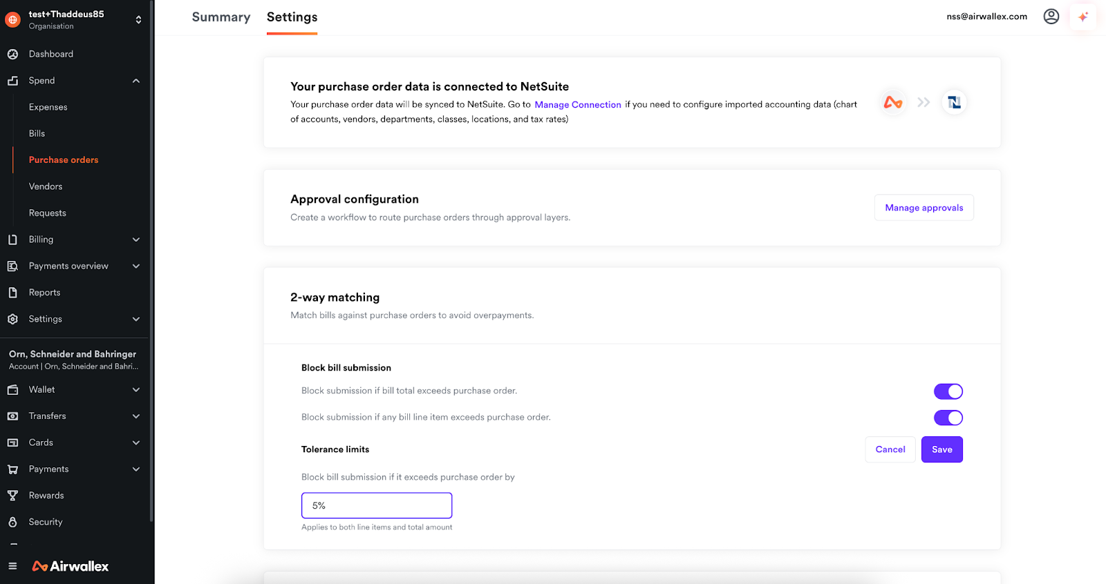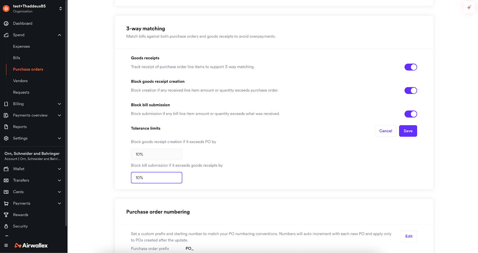 - Tolerance limits: To allow flexibility, users can submit a bill if its total and line items do not exceed the PO by more than the threshold. Airwallex will flag the discrepancy, but the user can still submit the bill for approval.