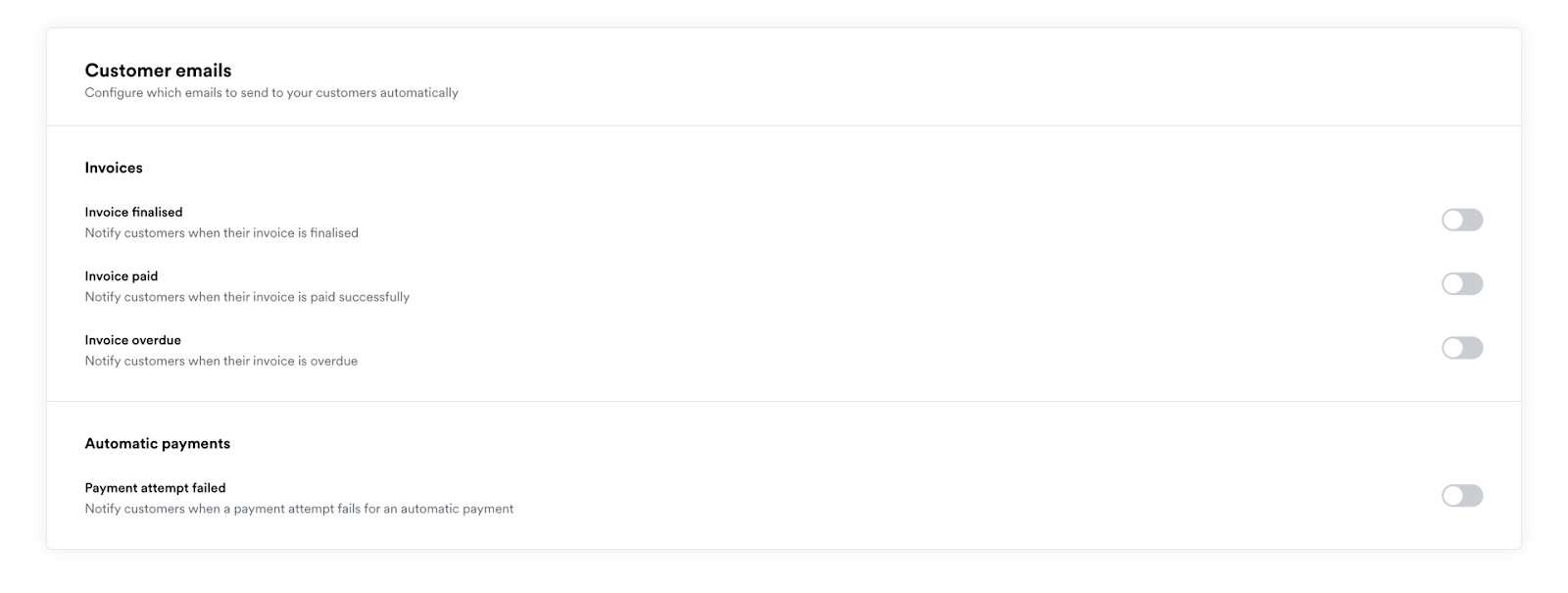 - If you’d want invoices to be automatically sent to your customers upon generation, make sure you’ve configured it within your Billing Settings