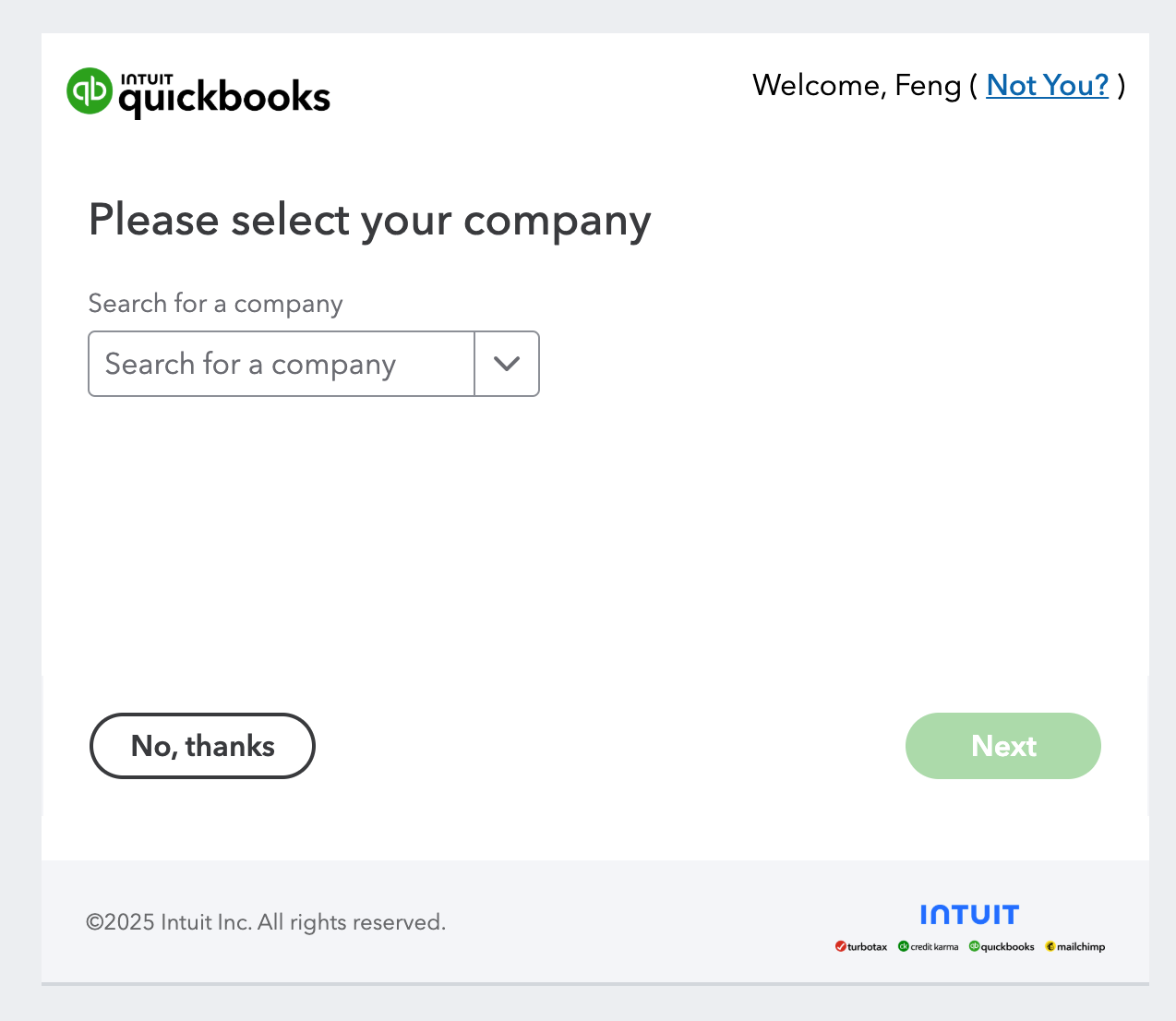 - To begin the connection, log in to your QuickBooks account and select your company.