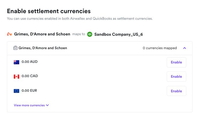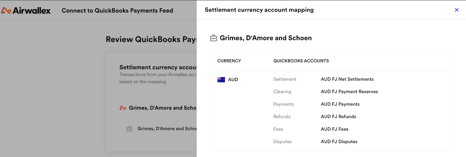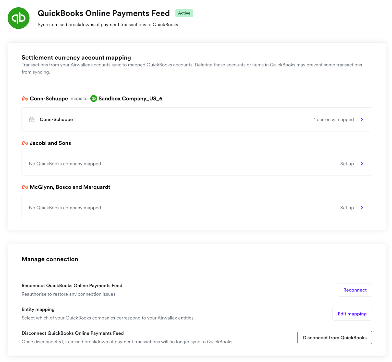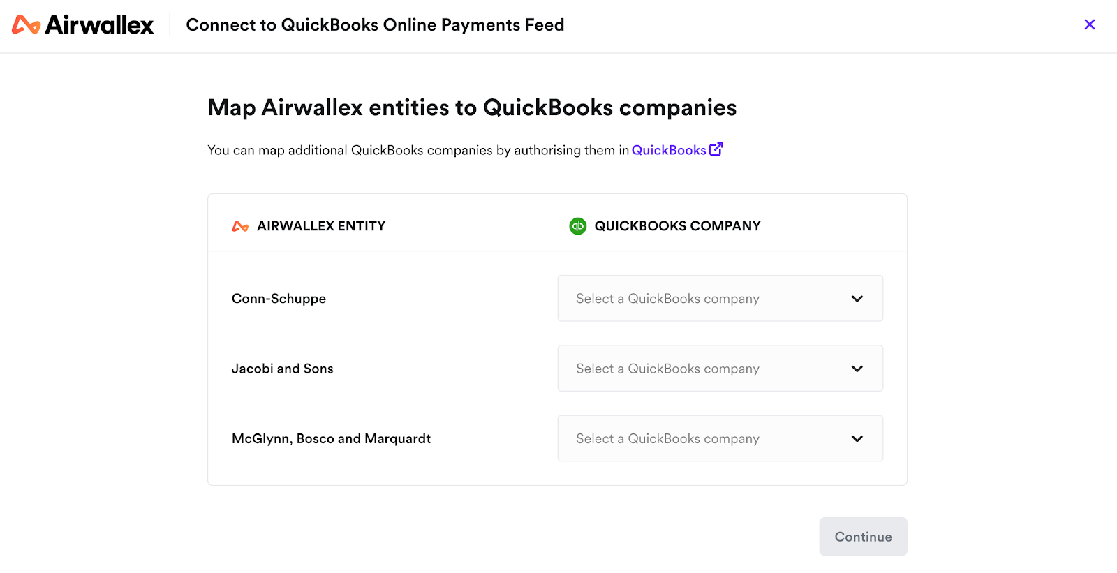 - Map your Airwallex entities to your QuickBooks companies. This will ensure that payment transactions across your Airwallex entities sync to the correct QuickBooks companies.