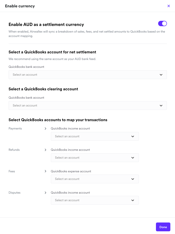 To set up the currency for syncing, you will need to make the following selections:- Select a QuickBooks bank account to sync your net settlement amount to. We recommend using the same bank account that you have configured for your QuickBooks bank feed