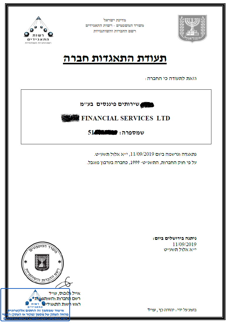 - Certificate of Incorporation issued by the Israeli Corporations Authority