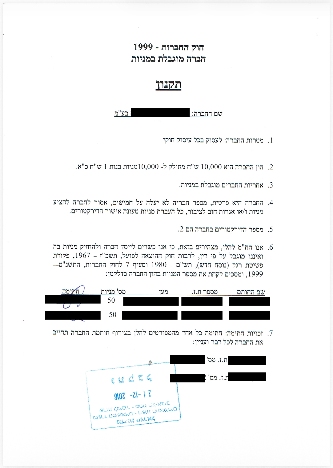 An official document issued by the Israeli Corporations Authority that proves your company is legally registered. Example below.