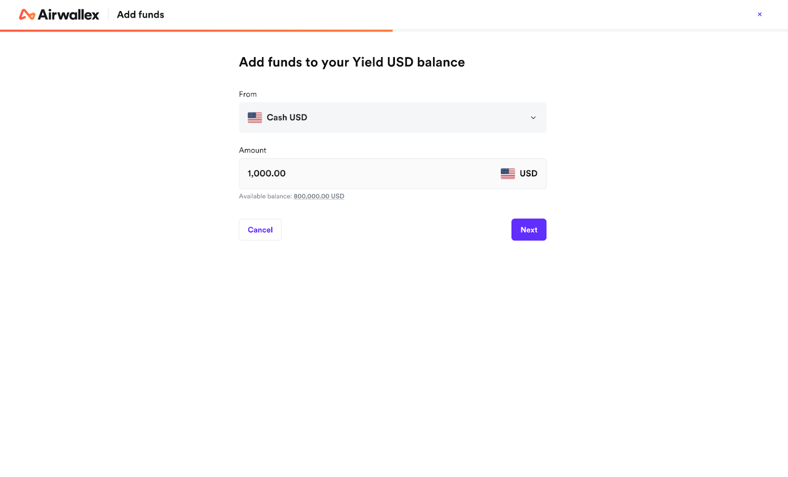 Choose the currency you wish to deposit (USD only) and input the amount, then click ‘Next’