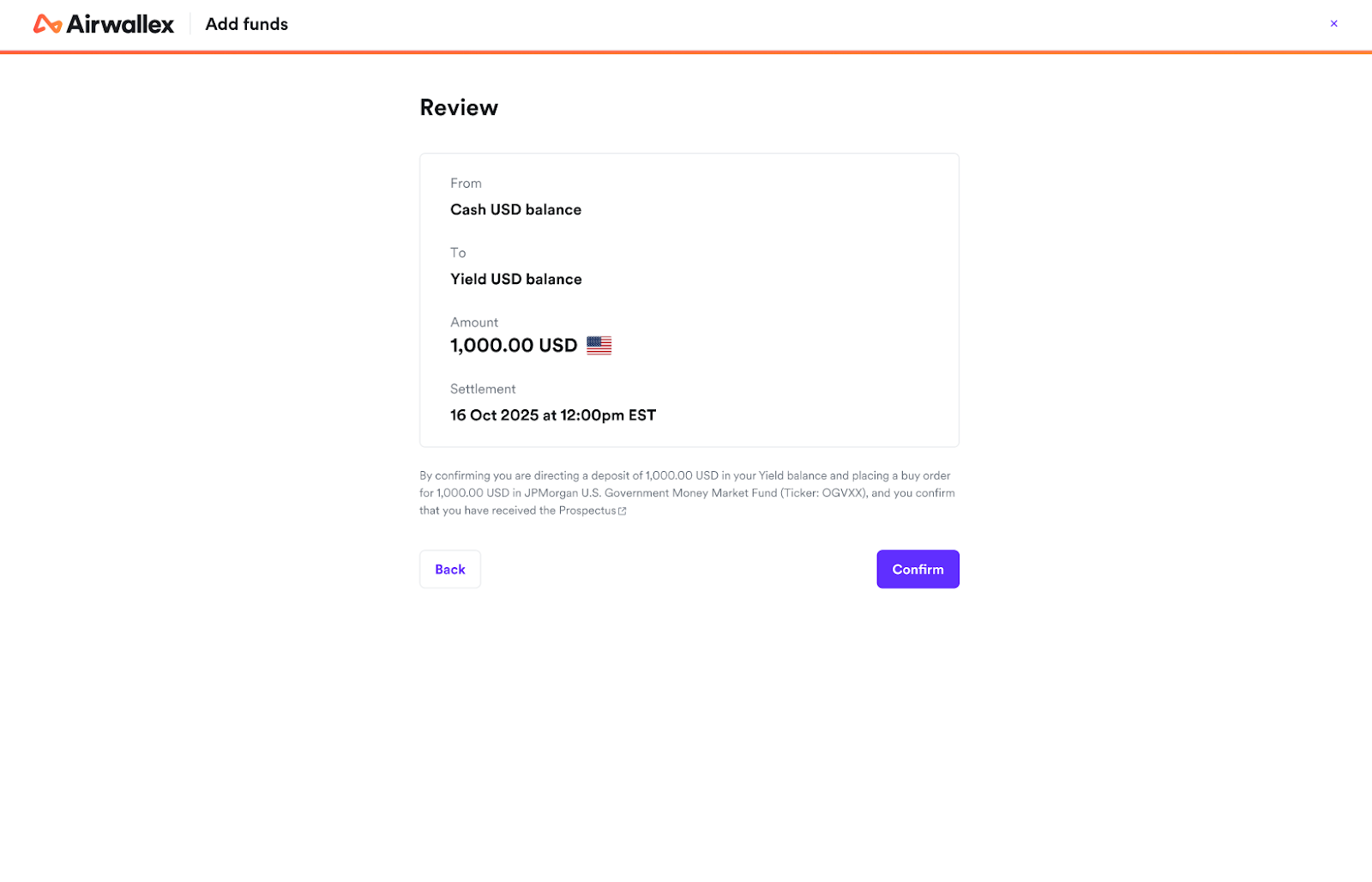 Review the information you’ve inputted and click ‘Confirm’ to submit your Yield deposit. By doing so, you are making a securities transaction and purchasing units in the fund.