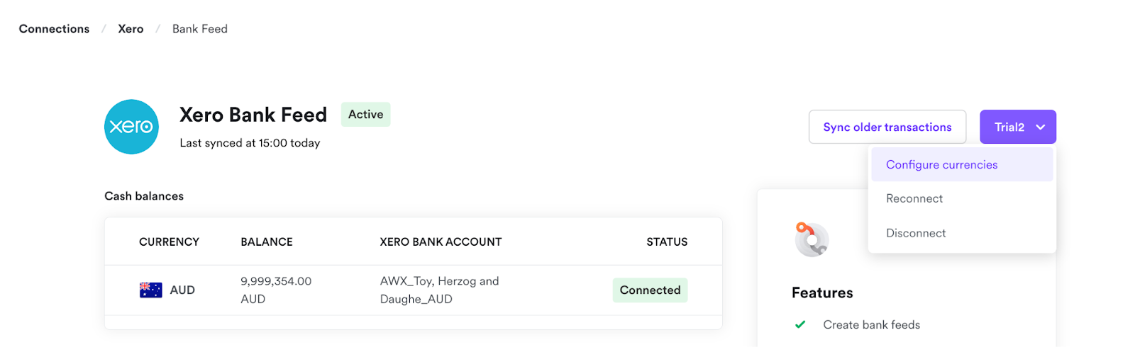 Step 3. Click on the button with your Xero organisation name and select Configure Currencies.
