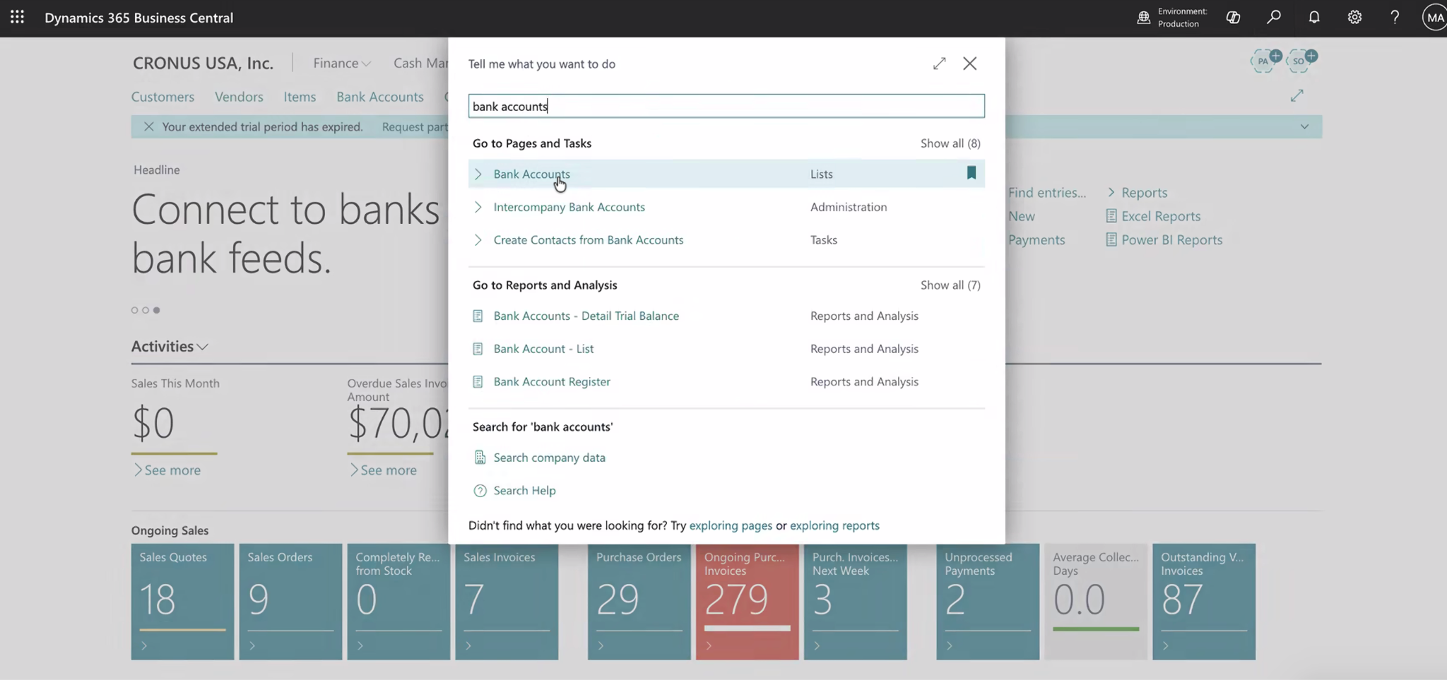 - Create the Bank Account: In Business Central, use the search bar to find and open the Bank Accounts list.