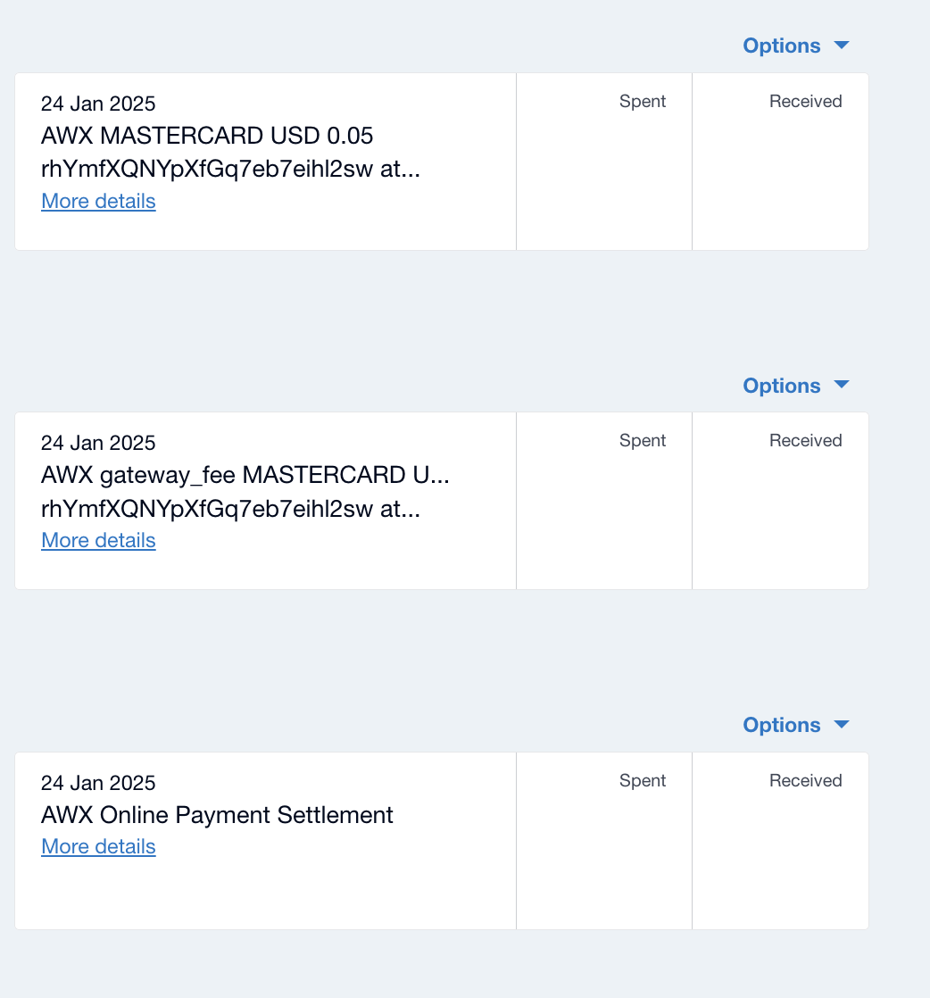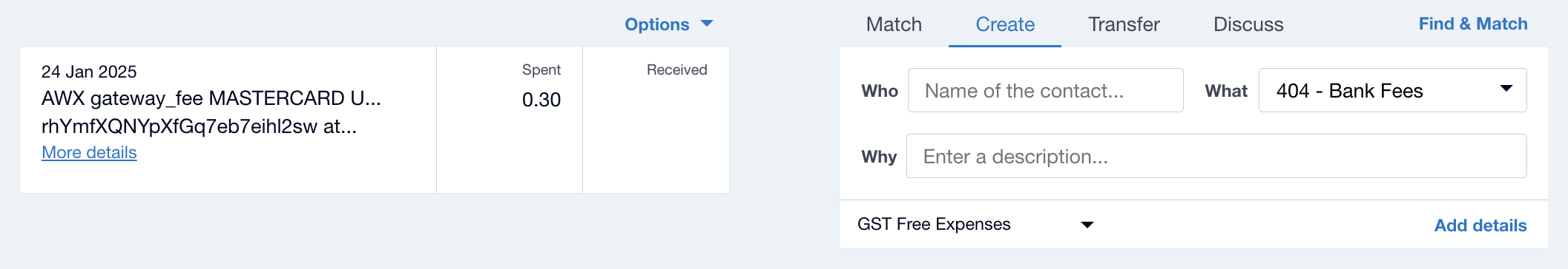- 当支付完成结算后,请前往Xero中的 “AWX_{账户昵称}_{币种}” 银行账户查看支付交易详情。通常您会看到以下几类交易:a) 收单金额 b) 手续费 c) AWX收单结算金额