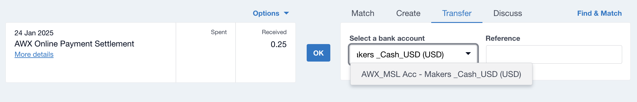 - 然后通过操作一笔转账,将结算金额匹配到银行交易数据账户(该账户应命名为 AWX_{账户昵称}_{Cash}_{币种})