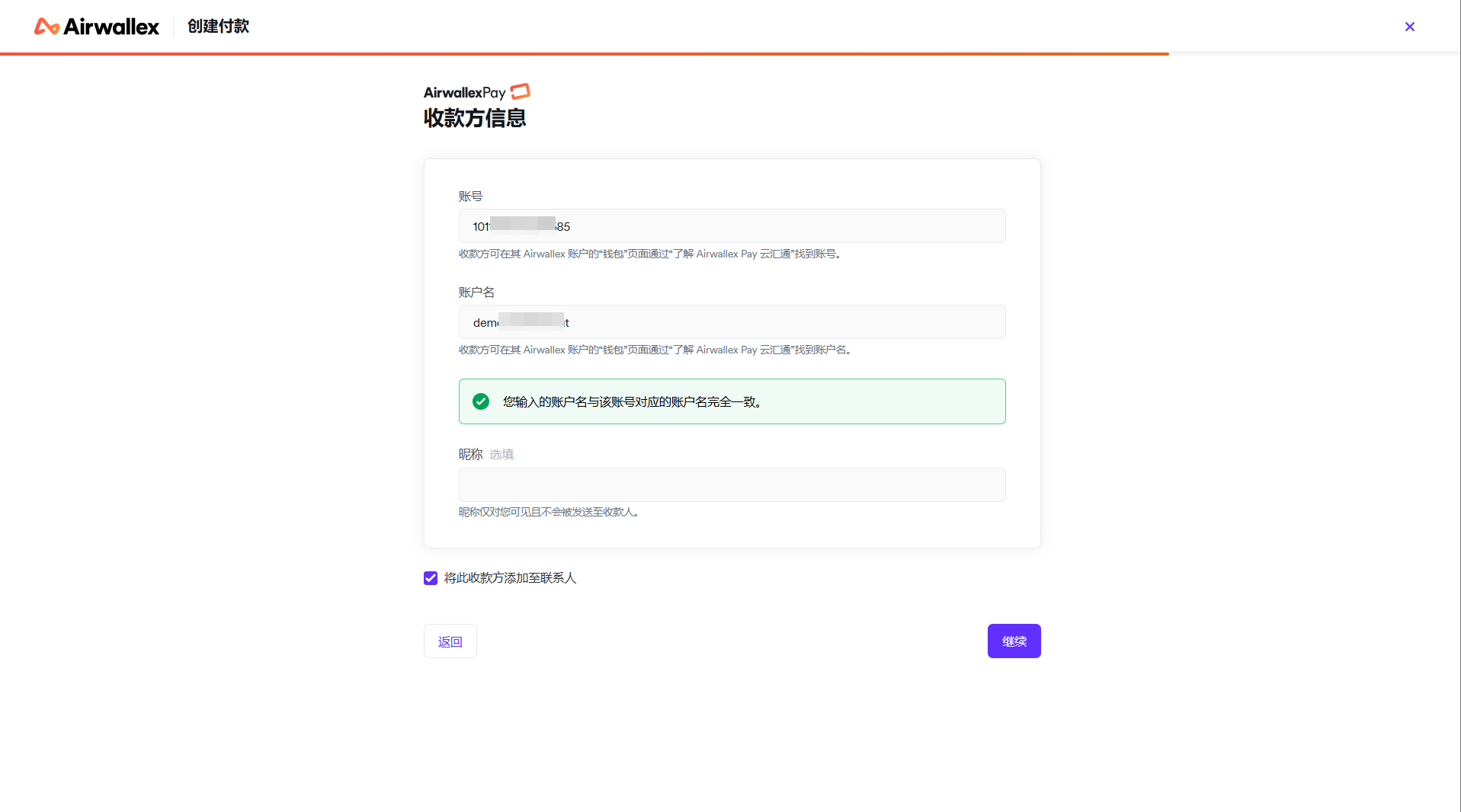 - 输入汇款金额和币种(勾选“以不同于收款人收到的币种进行付款”可任意选择扣除钱包中有足够余额的币种),点击“继续”