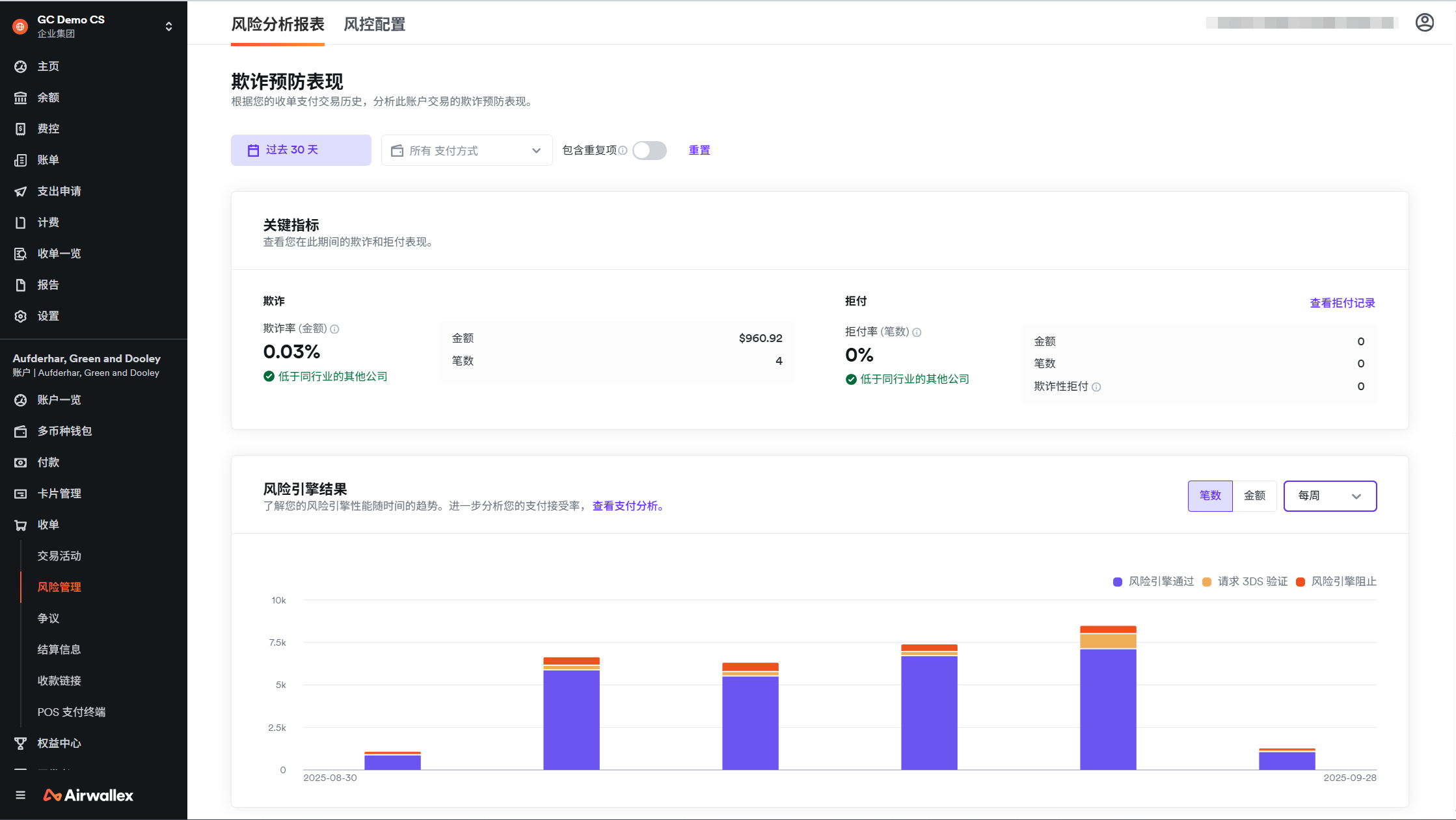 您可以在收单栏的“风险管理” > “风险分析报表”页面中观察我们实时防欺诈保护模型的表现。该页面显示了防欺诈的基本指标,并展示了风险引擎的表现如何影响整体收单交易的成功和欺诈率。