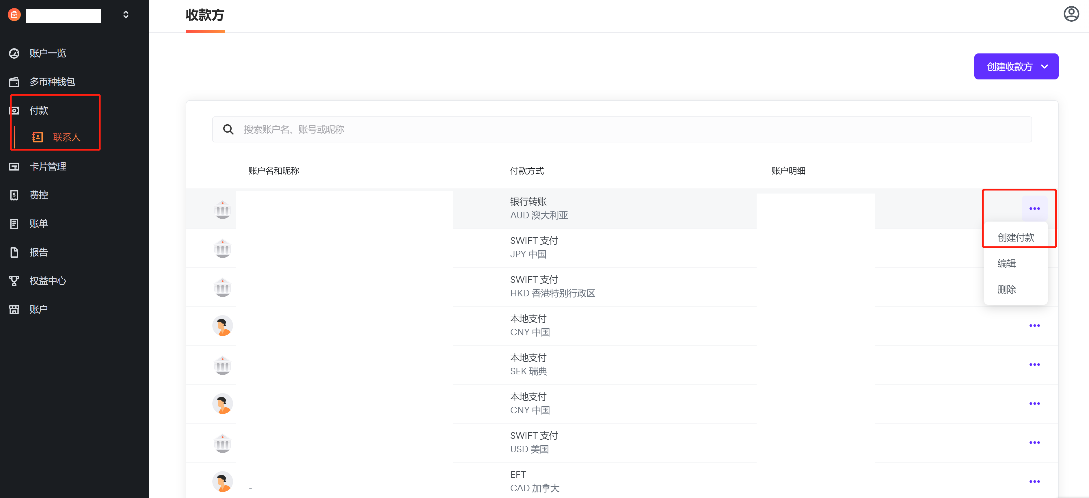 - 在现有联系人列表中找到您需要付款的收款人,点击创建付款,或点击创建收款方来创建新的收款方